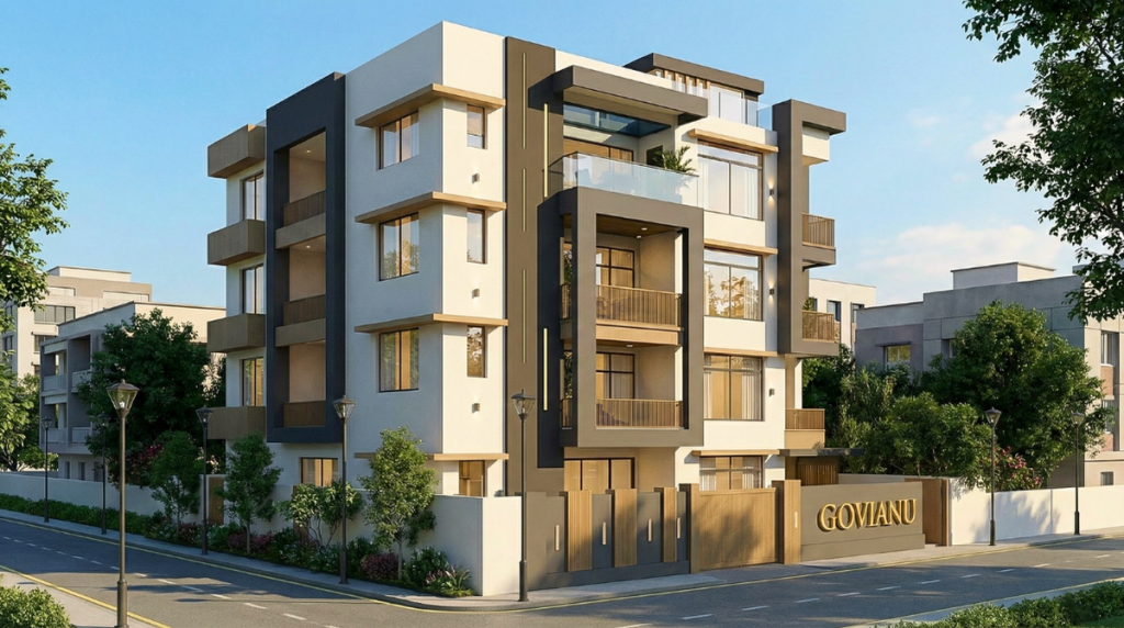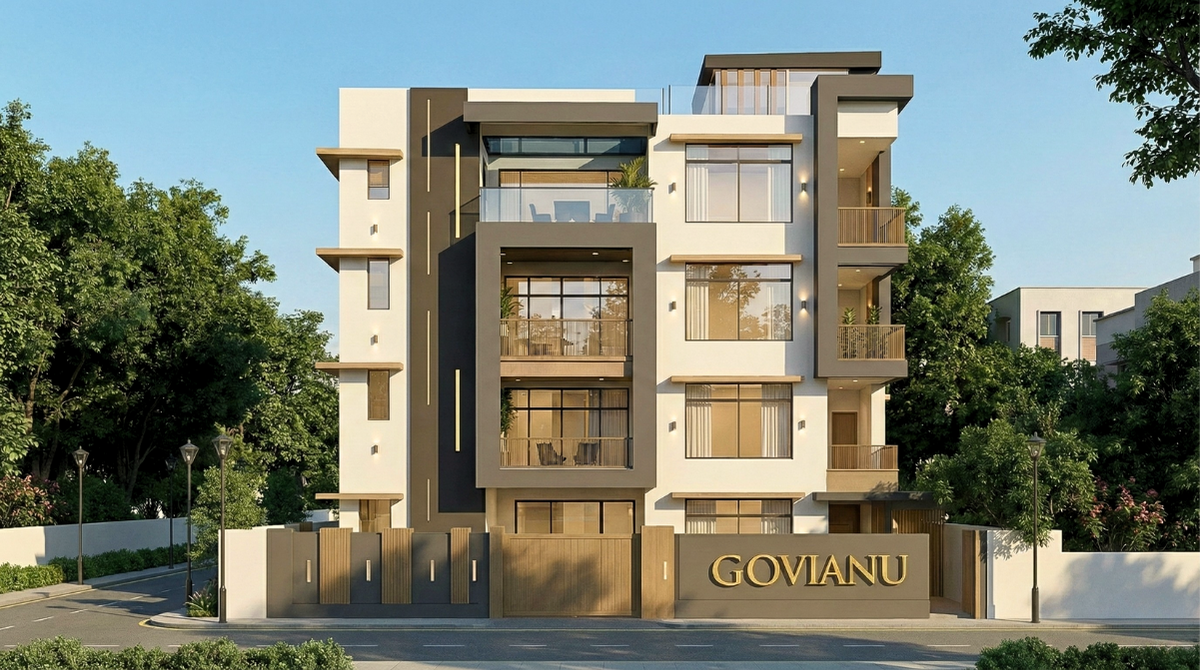 Blending refined aesthetics with superior construction quality, Govianu Madre Divina stands out with its sleek, contemporary elevation set within a serene, green neighbourhood. The modern architectural design enhances the visual appeal of the project while ensuring practicality and long-term value.